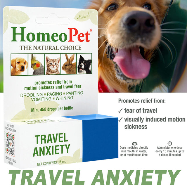 The HomeoPet Travel Anxiety Relief is a veterinarian-formulated natural solution designed to ease travel stress and motion sickness in dogs and cats. This gentle liquid formula works quickly to calm pets without sedation, ensuring they remain relaxed yet alert during car rides, flights, or vet visits. With soothing ingredients that target both anxiety and stomach upset, it reduces drooling, panting, and restlessness for a smoother journey. Safe for pets of all ages, these drops are easy to administer in food, water, or directly on a treat, making every trip more comfortable.