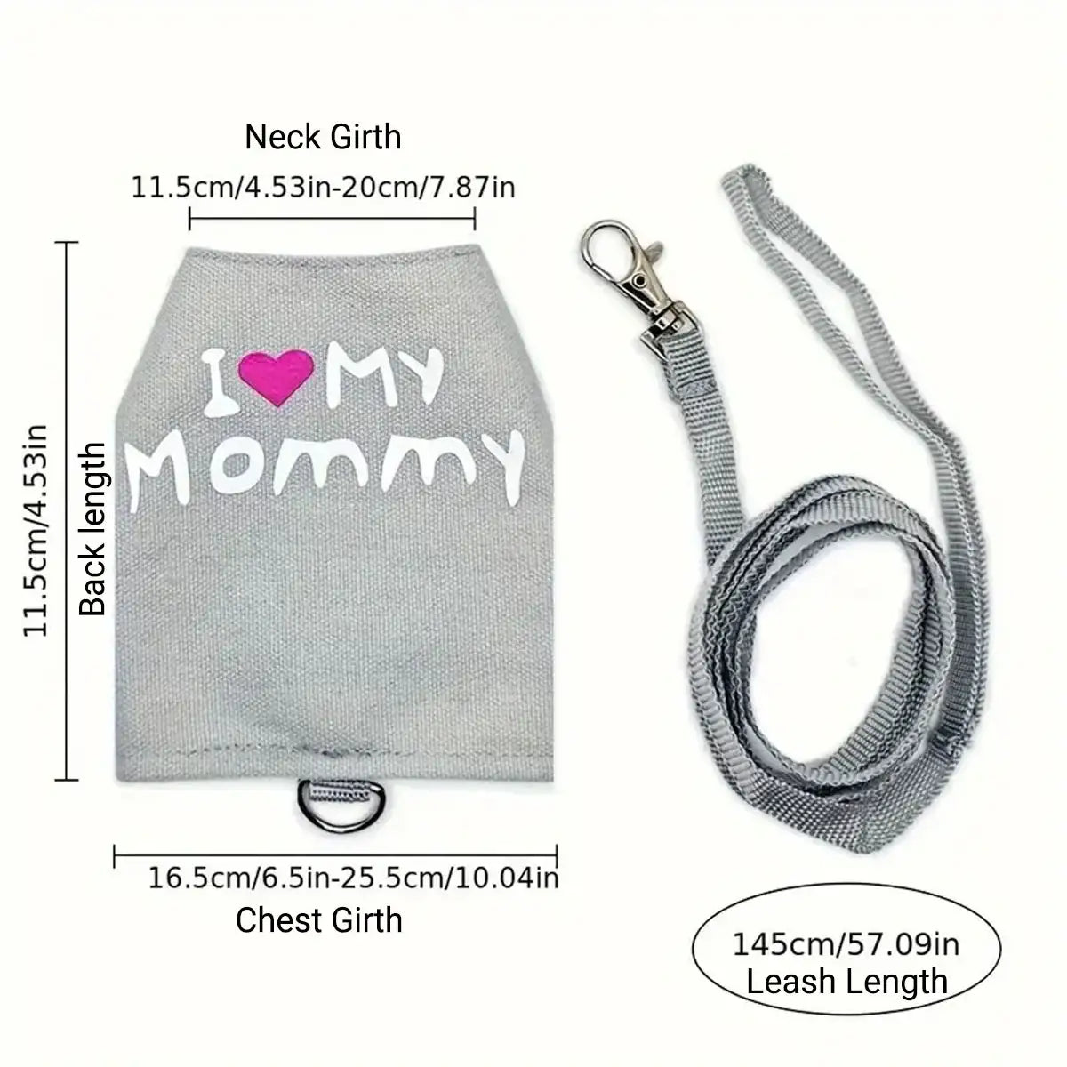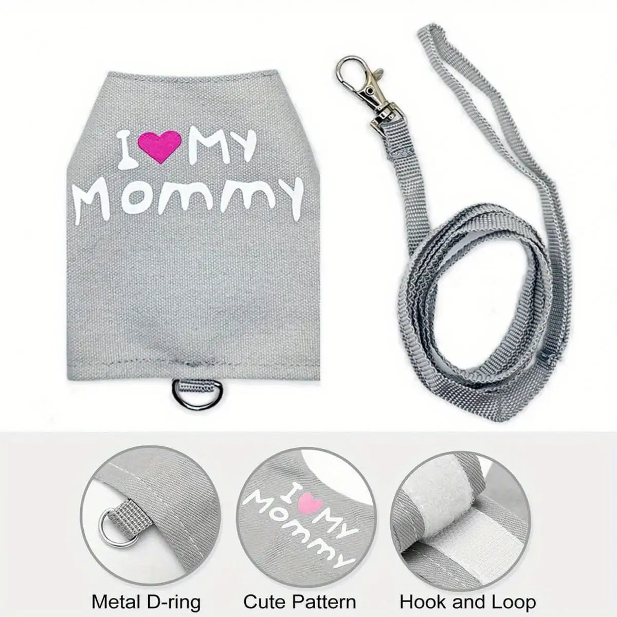 Keep your pet lizard safe and stylish with this luminous reptile clothes and leash set, designed for bearded dragons and other small reptiles. Featuring a cute "I ♥ Mommy" pattern with glow-in-the-dark letters, this soft and breathable harness vest ensures visibility at night while offering a snug fit. The included nylon leash clips to a durable metal D-ring, allowing for safe outdoor adventures. The hook and loop closure makes it easy to adjust and secure, making this reptile clothes and leash combo both functional and fashionable.