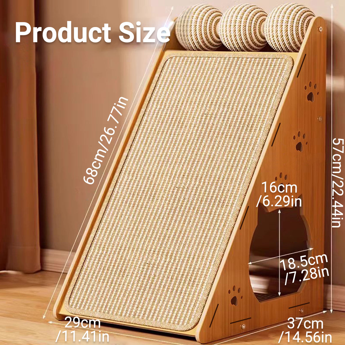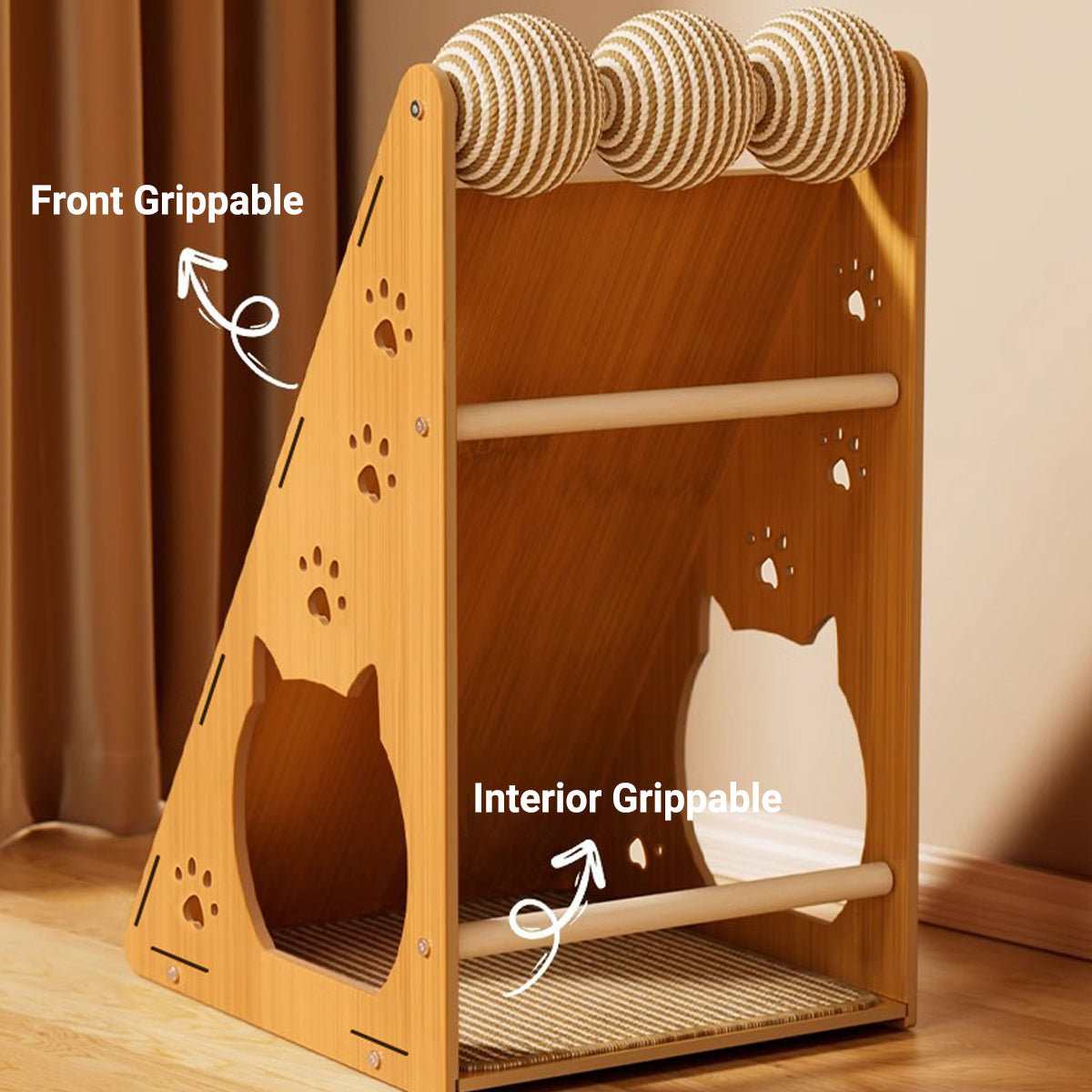 Keep your feline friends active and entertained with this multifunctional sisal cat scratching post. Designed with a stable triangular structure, it features a durable sisal mat that satisfies natural scratching instincts while protecting your furniture. The built-in playhouse with cat-shaped openings offers a cosy hideout, while the rotating hemp rope balls and grippable bars promote play and climbing. Whether your cat loves to scratch, rest, or explore, this sisal cat scratching post is a stylish and practical all-in-one solution for indoor enrichment.