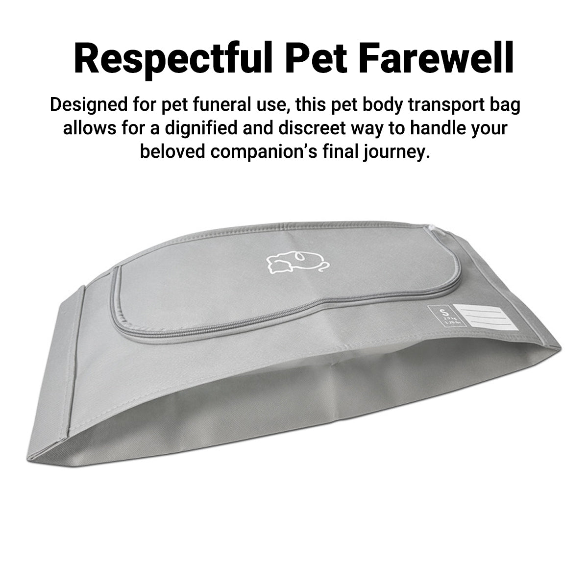 This pet body bag offers a respectful and practical solution for transporting your companion during their final journey. Made from durable non-woven fabric, it ensures strength and breathability while maintaining a discreet appearance. The animal body bag features a secure zipper closure and clearly labeled size tags for professional and personal use. Suitable for cremation, burial, or veterinary transport, this product provides peace of mind and dignity. The pet burial bag is available in both S and M sizes for small to medium pets.
