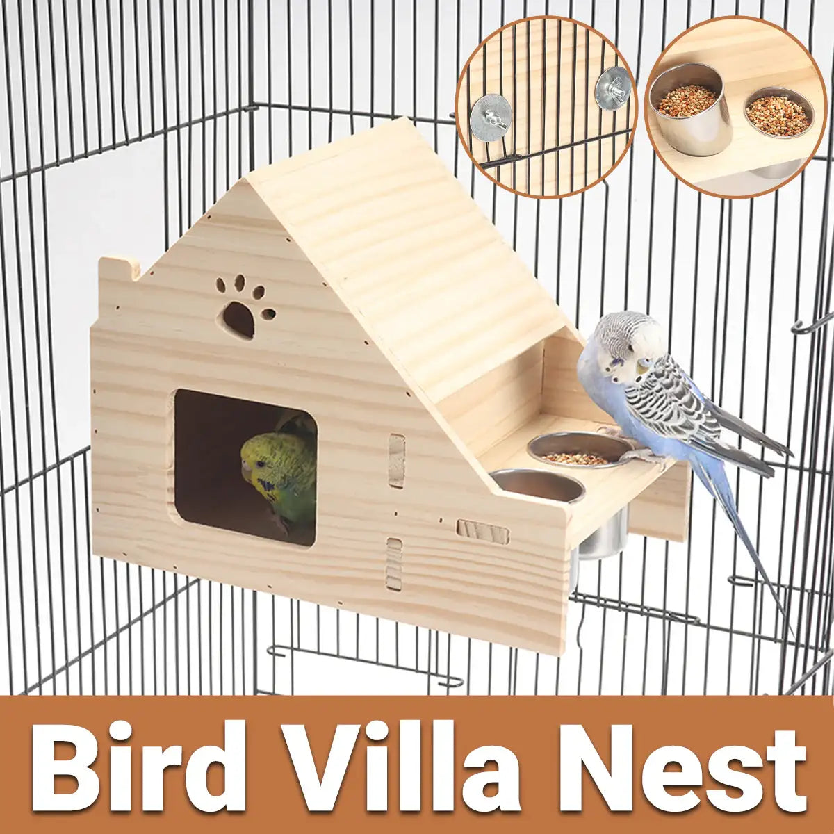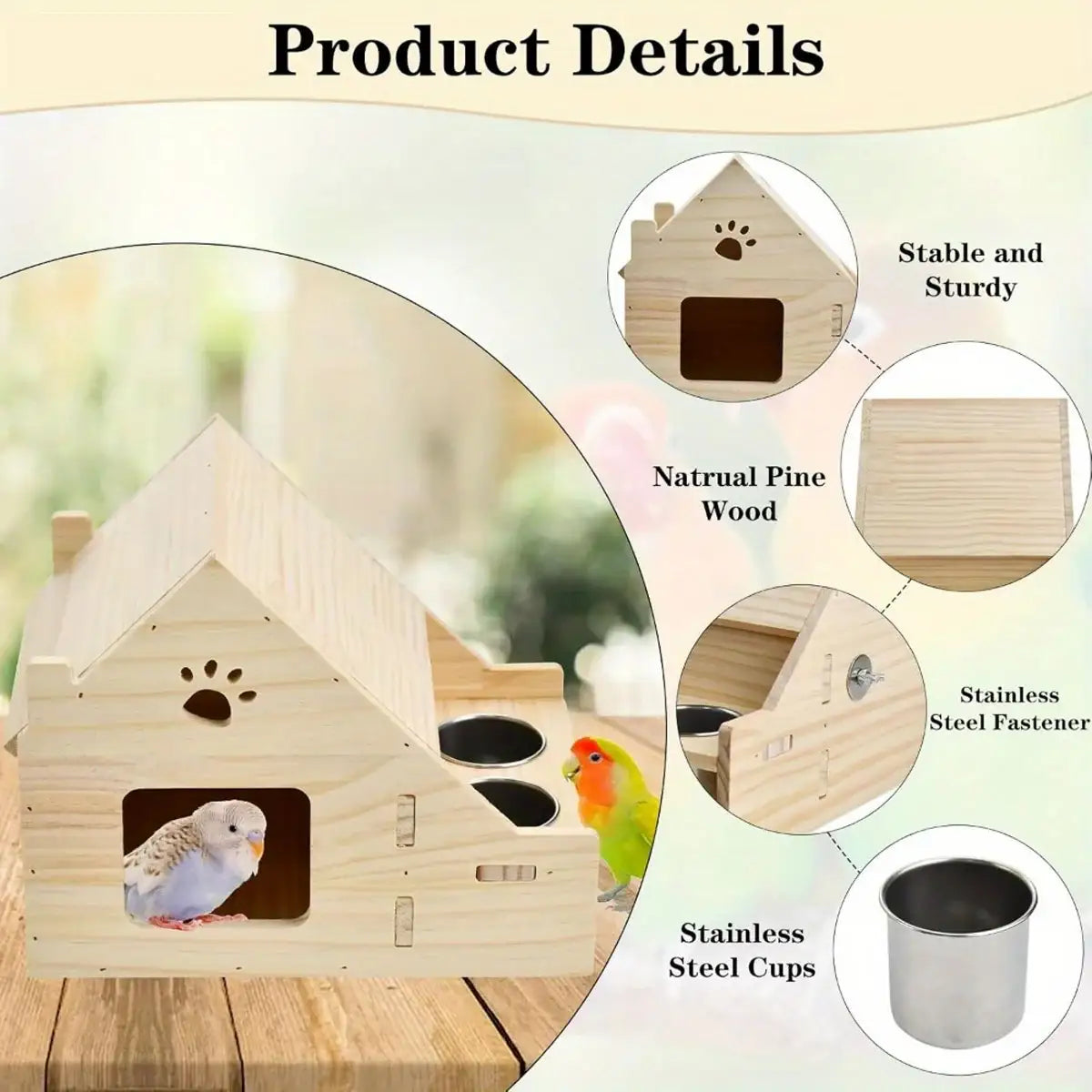 This multifunctional wooden bird house is the perfect all-in-one solution for your feathered friends. Crafted from natural pine wood, this charming wooden bird house offers a safe, non-toxic environment for nesting, feeding, and breeding. Designed especially for budgerigars, lovebirds, and finches, this sturdy wooden bird house combines a cozy bird villa with stainless steel feeders for food and water. Whether you're supporting breeding or providing a restful hideaway, this bird nesting box delivers safety and functionality.