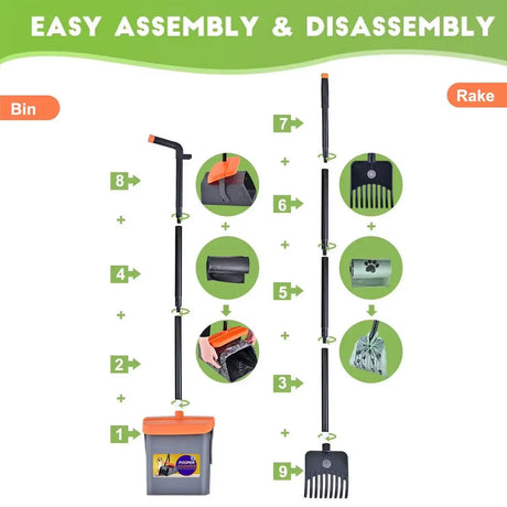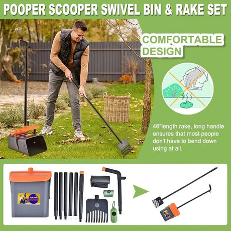 Pooper Scooper Swivel Bin & Rake Set Easy Pet Waste Cleanup with 35 Bags