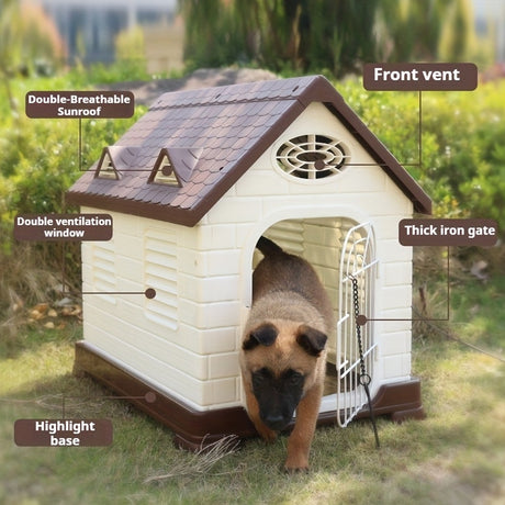 Outdoor Plastic Dog House with Ventilation and Iron Gate