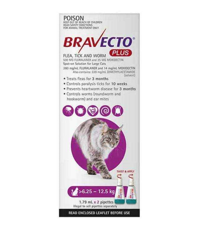 Bravecto Plus 6.25-12.5kg Cat Flea Tick & Worm 2 X PIP 3 Months
