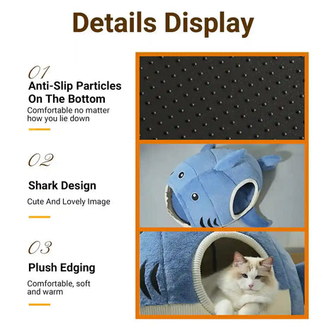 Shark Cat Cave Bed with Plush Cushion for Small Pets