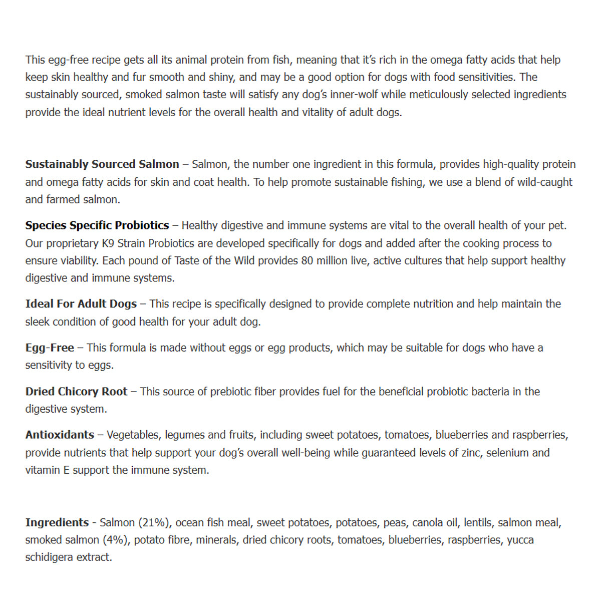 - Grain-free and egg-free formula suitable for sensitive dogs