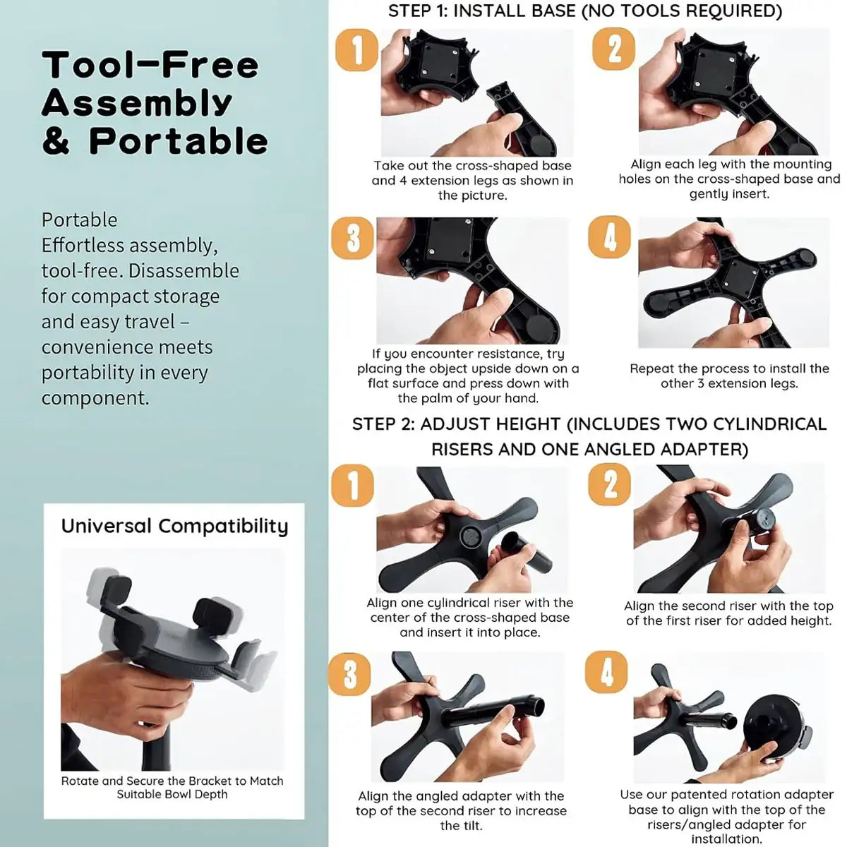 This adjustable dog bowl stand is designed to promote healthy feeding posture and comfort for dogs of all sizes. Featuring three height settings and a 15° tilted bracket, this stand elevates your pet's bowl to reduce neck pressure and joint strain. The rotating bracket holds the bowl securely in place, making it ideal for both food and water. With tool-free assembly and a sturdy cross-shaped base, the adjustable dog bowl stand is suitable for use on smooth indoor floors or outdoor camping mats.