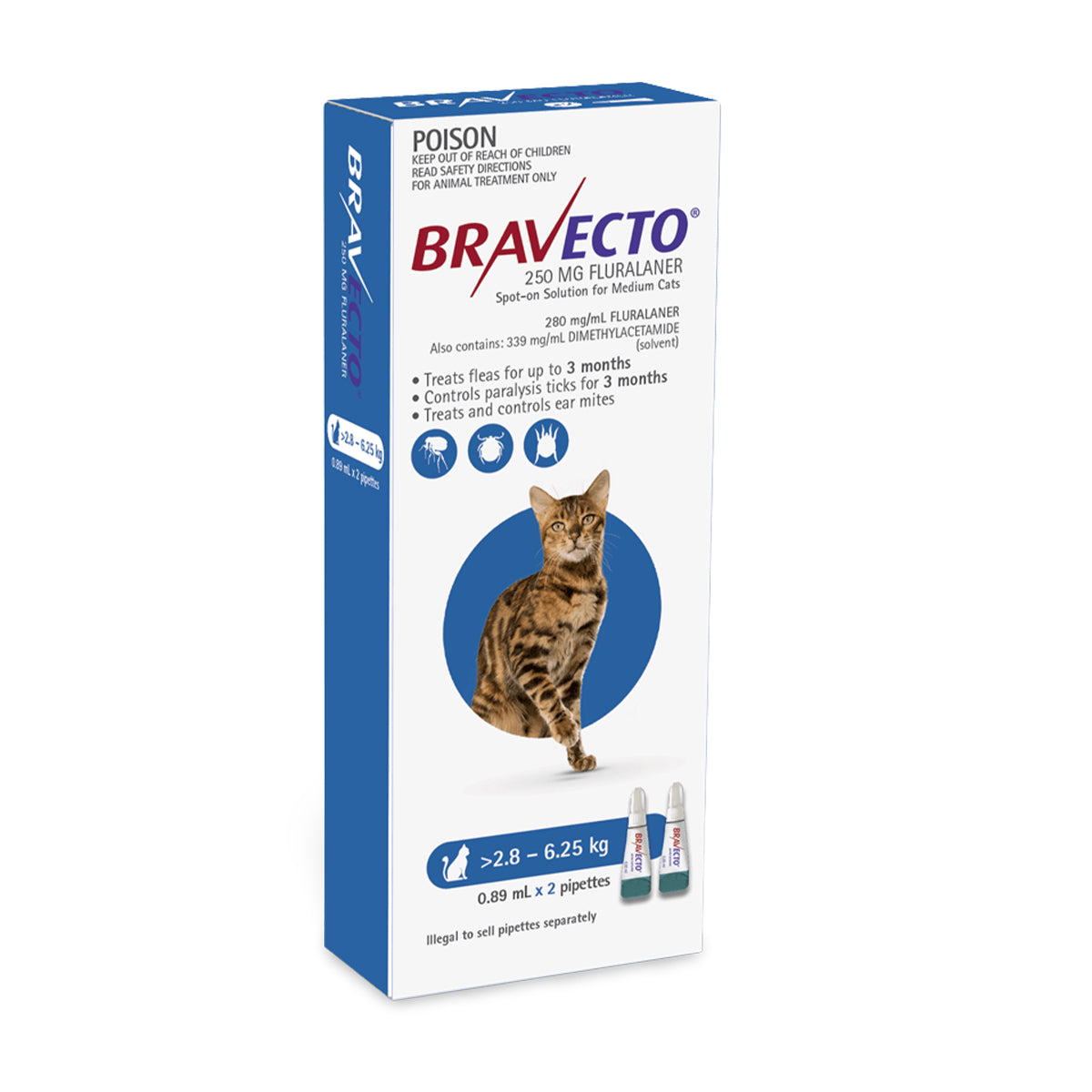 BRAVECTO Spot On For Medium Cats Blue 2'S 250MG 2.8-6.25KG