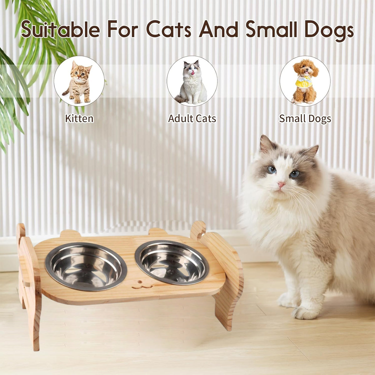 Make mealtime healthier and tidier with this elevated cat dog raised bowl stand featuring two stainless steel bowls. Designed with a 15° tilt and adjustable height, this cat dog raised bowl stand reduces strain on your pet’s neck and joints, promoting better digestion and posture. Crafted from waterproof-coated natural wood, it’s easy to assemble, clean, and blends beautifully into any home. This cat dog raised bowl stand is ideal for kittens, adult cats, and small dogs, offering an ergonomic dining experience in a cute and functional design.
