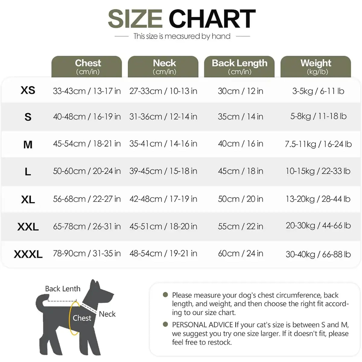 • Sizes Available: XS to XXXL (see size chart for chest, neck, and back length)