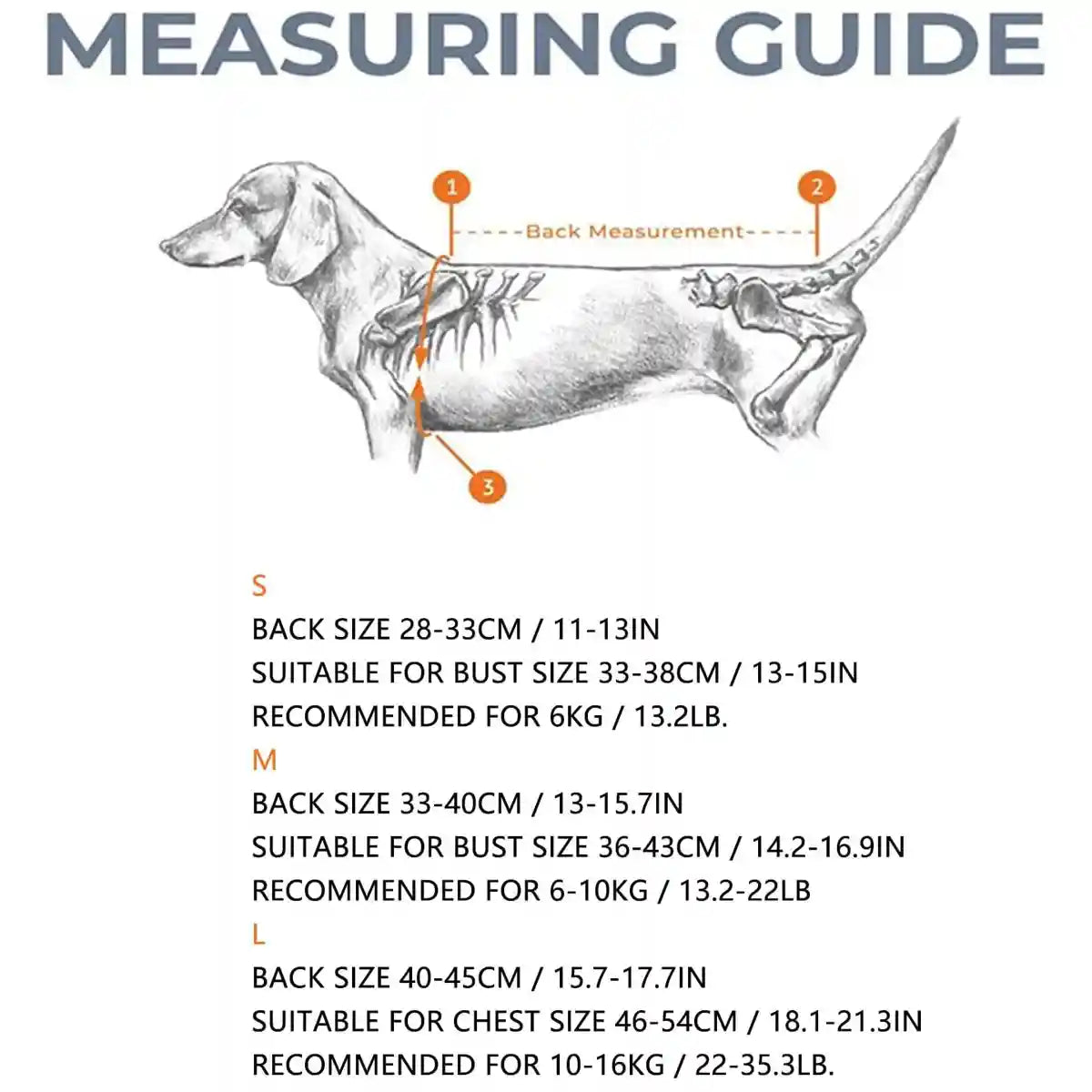 M: Back 33–40 cm (13–15.7 in), Bust 36–43 cm (14.2–16.9 in), Recommended 6–10 kg / 13.2–22 lb