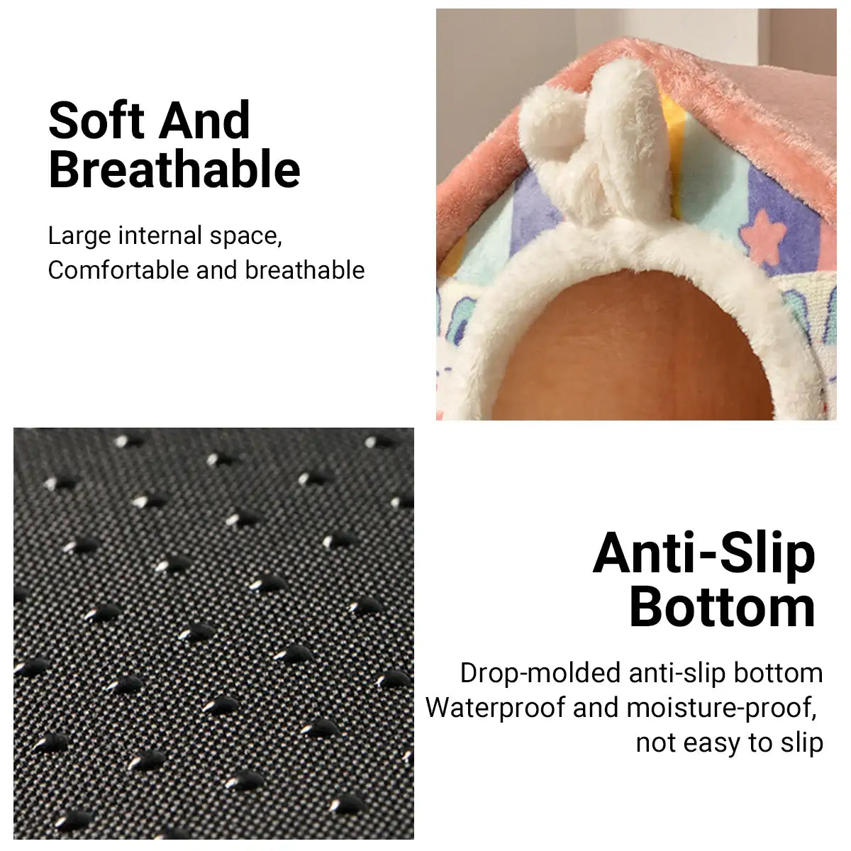 Create the ultimate cozy retreat for your feline friend with our cat house. Designed as a charming pet villa, this soft and breathable cat house offers a warm, secure space for indoor cats and small dogs. With its fully detachable design, you can easily fold it for travel or storage. The cute bunny-ear roof and vibrant pattern add decorative charm to your home, while the anti-slip, moisture-proof bottom ensures stable placement on any floor surface. Whether for lounging, sleeping, or hiding away, this adorable cat house blends comfort with function in one delightful package.