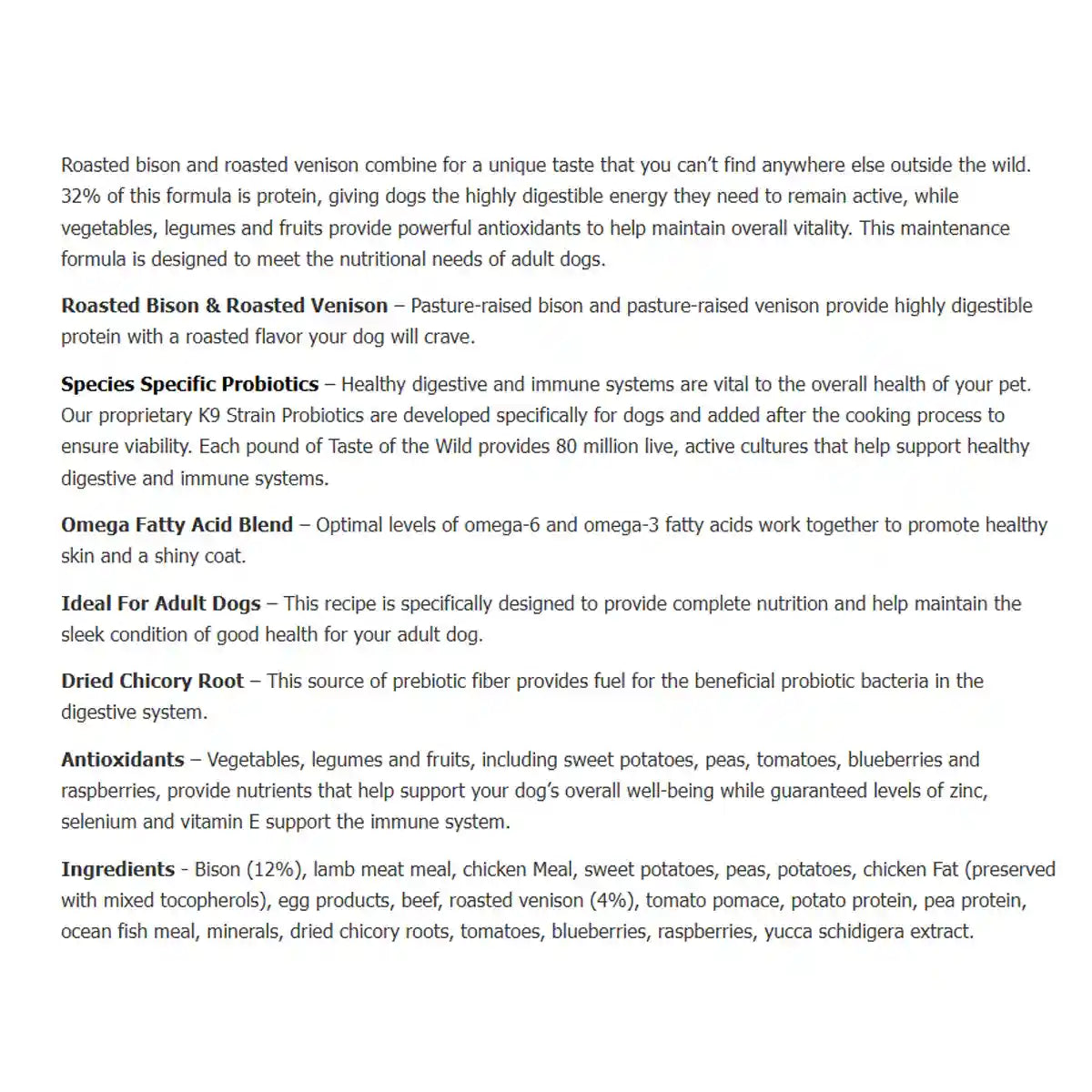 • Primary ingredient: high-quality pasture-fed bison for lean protein