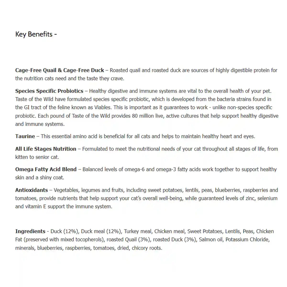 • Primary Proteins: Duck (12%), Duck meal (12%), Turkey meal, Chicken meal, Roasted Quail (3%), Roasted Duck (3%)