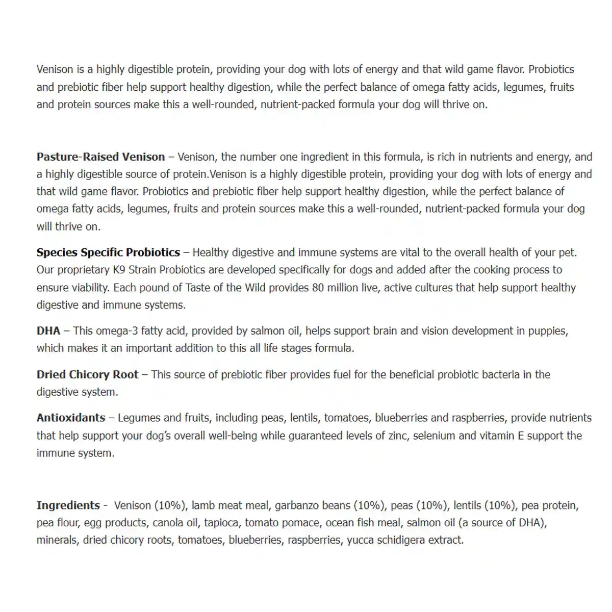 • Primary ingredient: pasture-raised venison for lean, high-quality protein